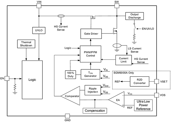 SGM6000 1.75V 至 5.5V 输入,静态电流 300nA,输出电流 700mA 的同步降压转换器