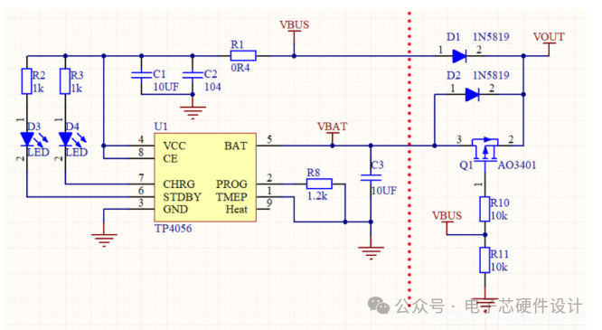 2. 防反接与续流:D1、D2为肖特基二极管(1N5819),单向导通防止电流倒灌,同时在VBUS/电池切换时提供续流路径,保证VOUT输出稳定。