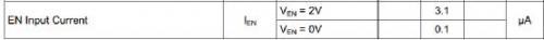 需要注意的是RC中的电阻也不能过大,要满足EN引脚所需的电流需求。如下图所示为某电源芯片手册中EN输入电流条件。