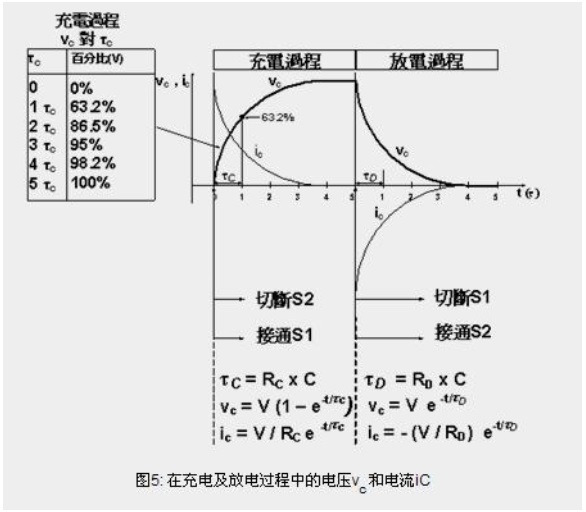 电阻值R和电容值C的乘积被称为时间常数τ,这个常数描述电容的充电和放电速度,见图5。
