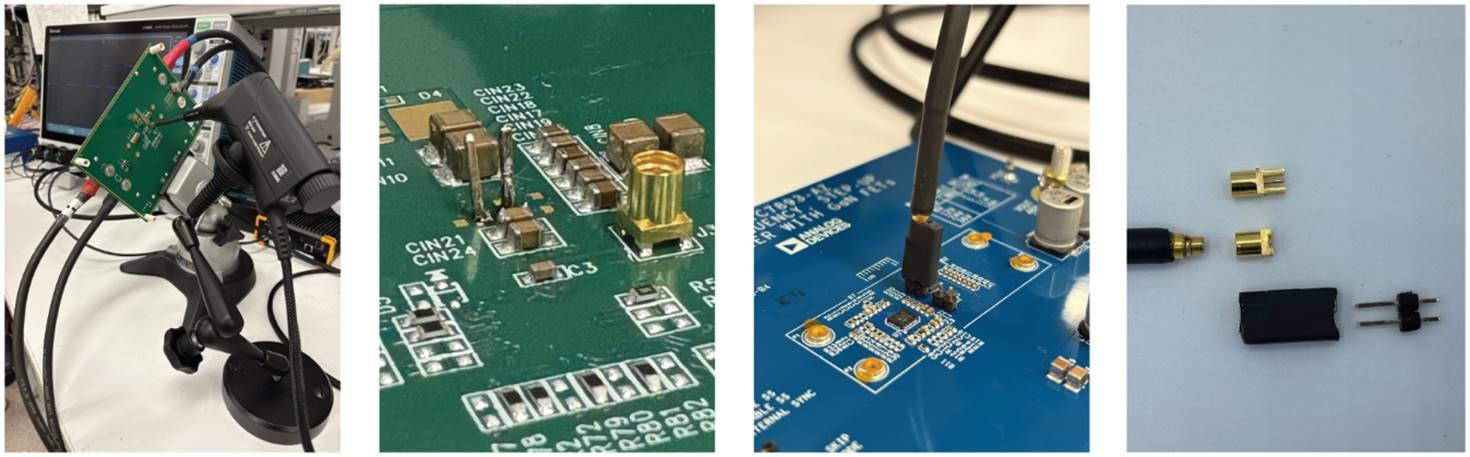 图4显示了实际工作场景中的隔离探头。此类探头通过光缆连接到示波器,既实现了电气隔离,又有效降低了共模输入电容。探头的衰减器尖端直接插入MMCX连接器。探头还可通过接头引脚和MMCX转方形引脚适配器连接到PCB测试点。为确保探头发挥最佳性能,探头尖端与PCB之间的连接应尽可能短,并采取有效屏蔽措施。板载的MMCX连接器可提供最佳同轴连接,但务必从FET栅极和源极引出短开尔文走线。隔离探头可能是测量高边GaN栅极电压的最佳方法,甚至可能是唯一可行的方法,但我们不妨比较一下另一种常见方法的表现。